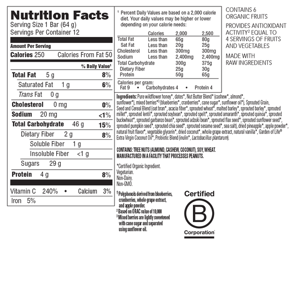 Every product of Life Whole Food Antioxidant† Matrix Bar contains 6 natural leafy foods the cell reinforcement action of 4 servings of foods grown from the ground including 240% of the Daily Value of nutrient C—all enveloped with a mid year berry taste. At Garden of Life, we are committed to Empowering Extraordinary Health®. Our Living Foods bars consolidate the integrity of sound entire nourishments, for example, natural organic product, nuts and grew grains with valuable live probiotics, all improved with nectar to make a fantastically fulfilling bar that is both tasty and nutritious for you. Each bar contains dissolvable fiber, including oat beta glucan.