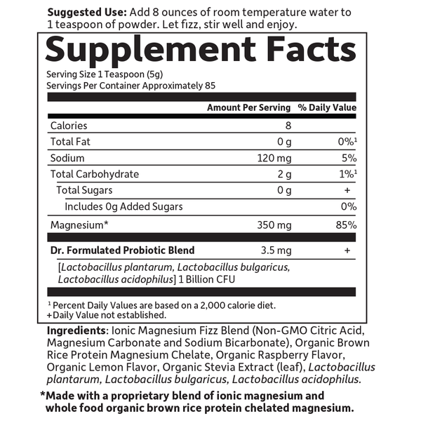 Dr. Defined Whole Food Magnesium highlights natural dark colored rice protein magnesium chelate, just as, live probiotics—1 billion CFU—to help solid absorption and regularity.†